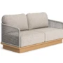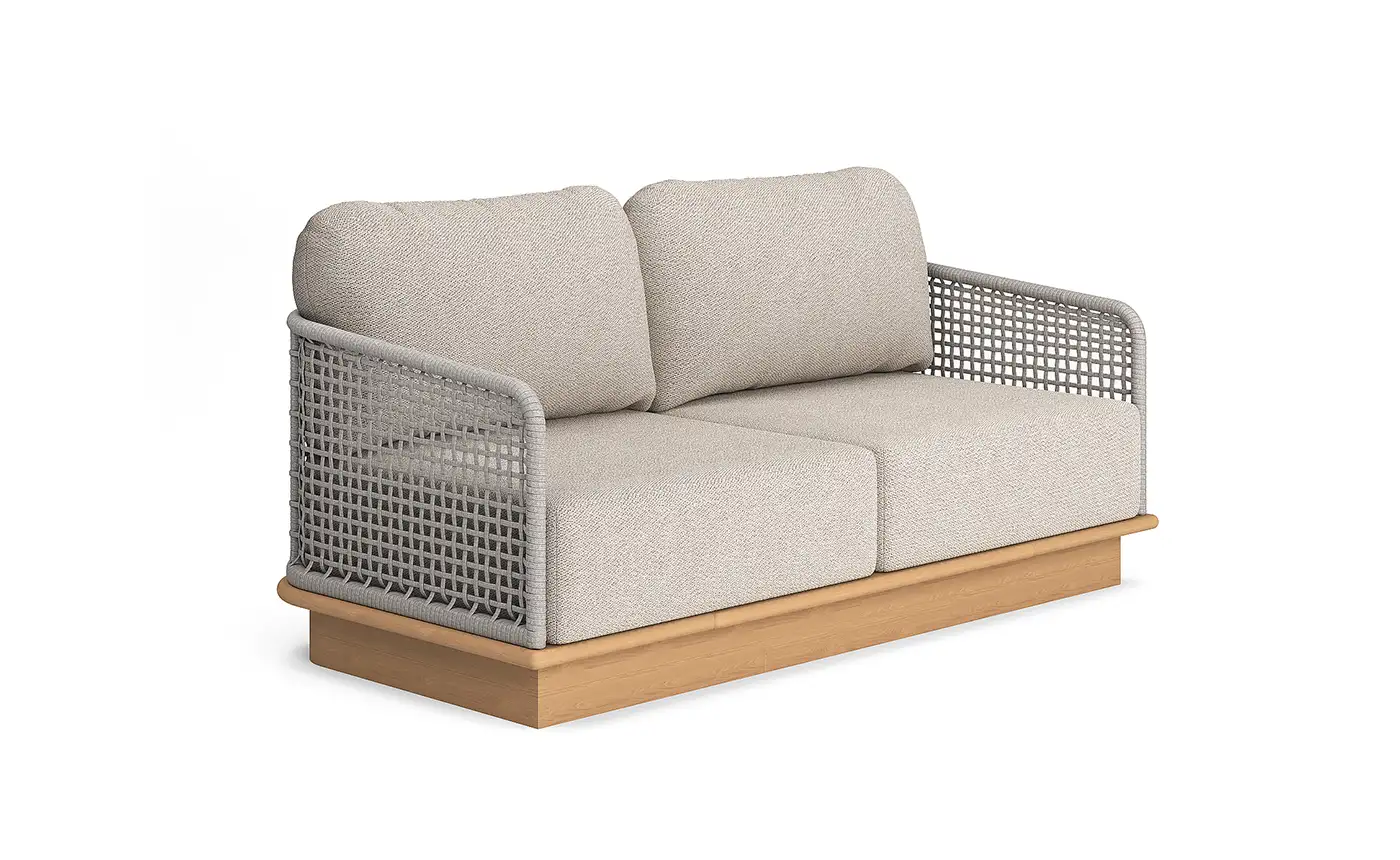 Az Acri 2 személyes szófa teakfa váza és finoman megmunkált len kötélfonott háttámlája természetes és időtálló stílust kínál. Az időjárásálló, vízáteresztő Sunbrella párnák tartós kényelmet nyújtanak, miközben megőrzik elegáns megjelenésüket. Harmonikus dizájnja tökéletesen illeszkedik bármely kültéri környezetbe.