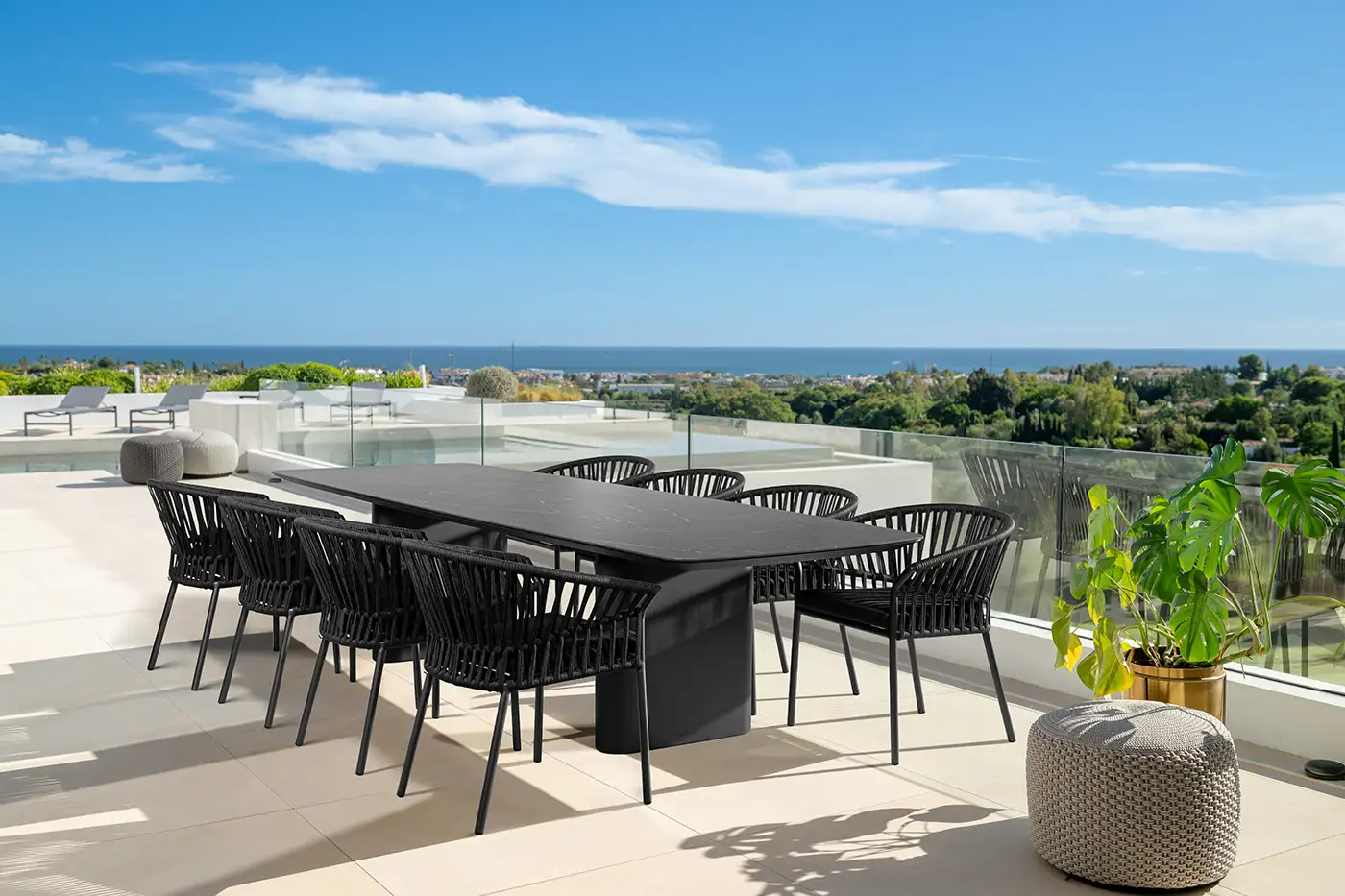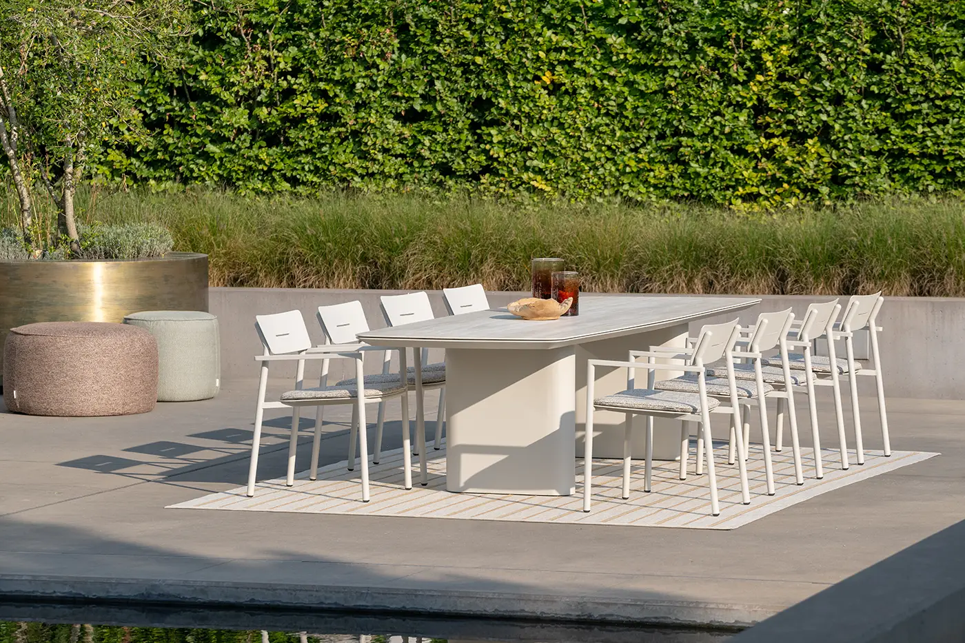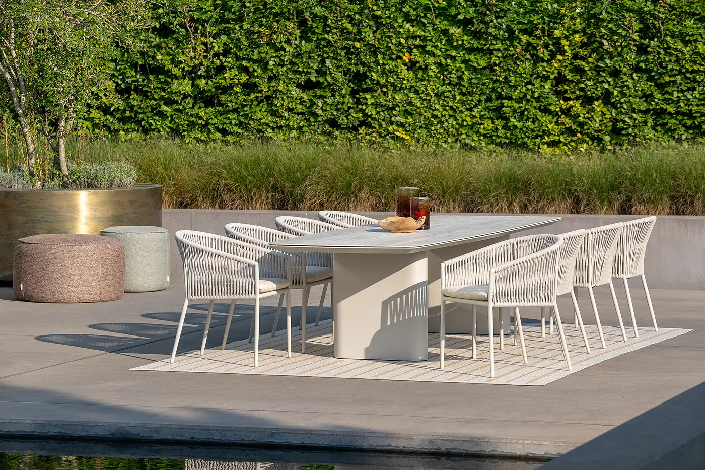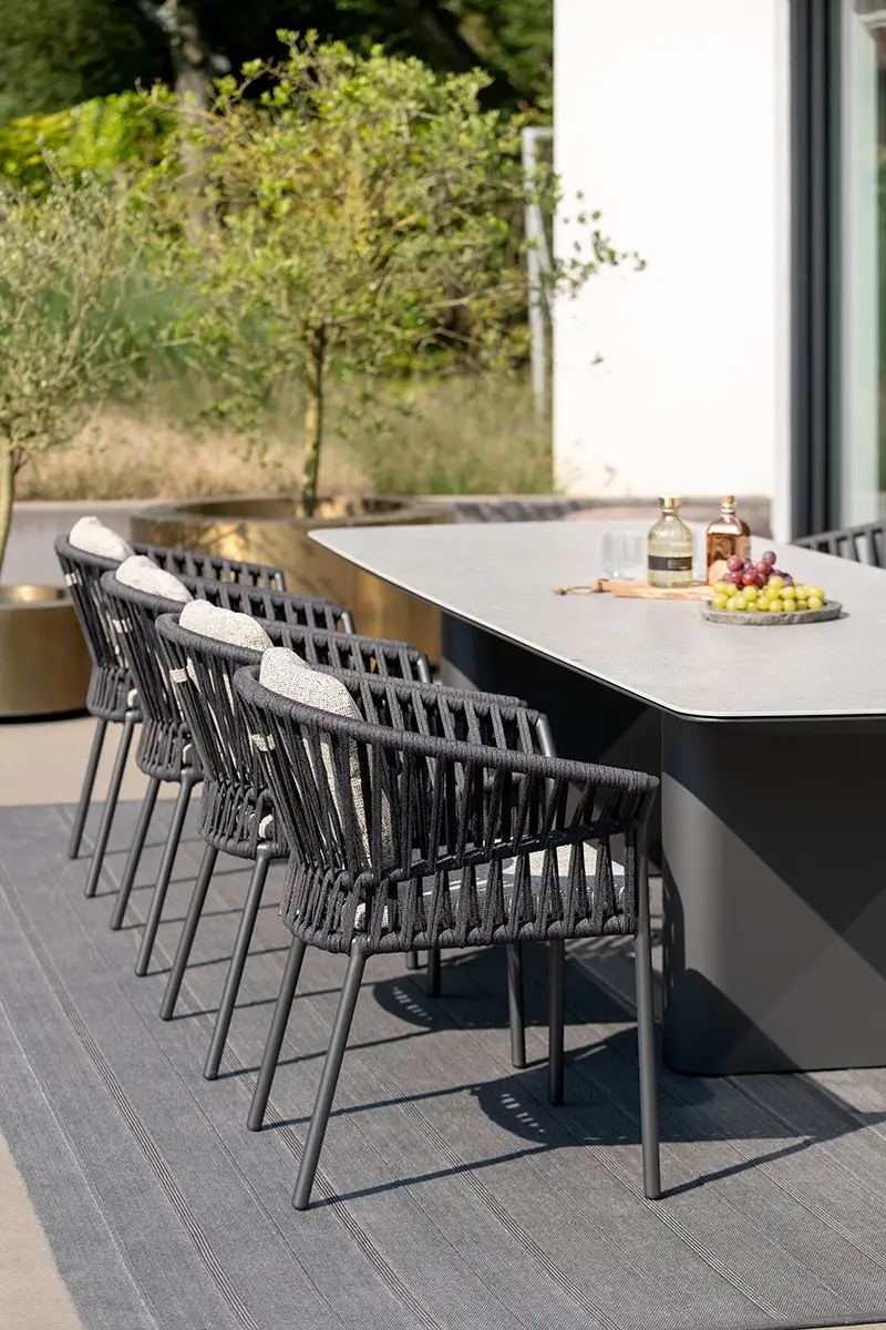 Az Amorelli étkezőasztal elegáns és időtálló darab, amely bármely terasz vagy kert központi eleme lehet. Kerámia tetőlapja rendkívül tartós és könnyen tisztítható, míg letisztult, alumínium váza stabilitást és modern megjelenést biztosít. Lekerekített formái stílust és kifinomultságot kölcsönöznek ennek a prémium kerti bútornak.