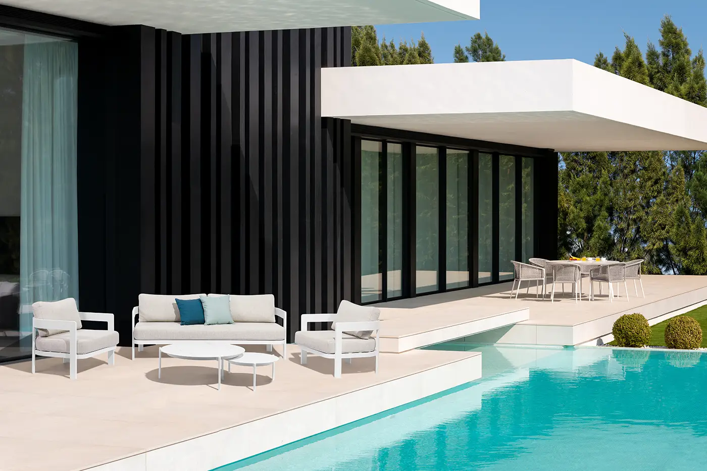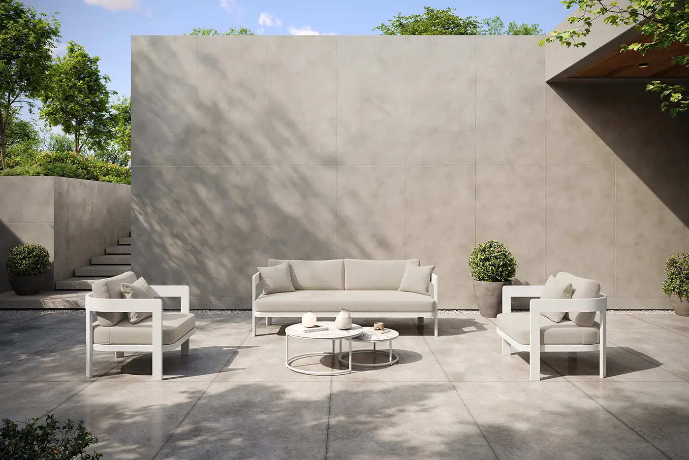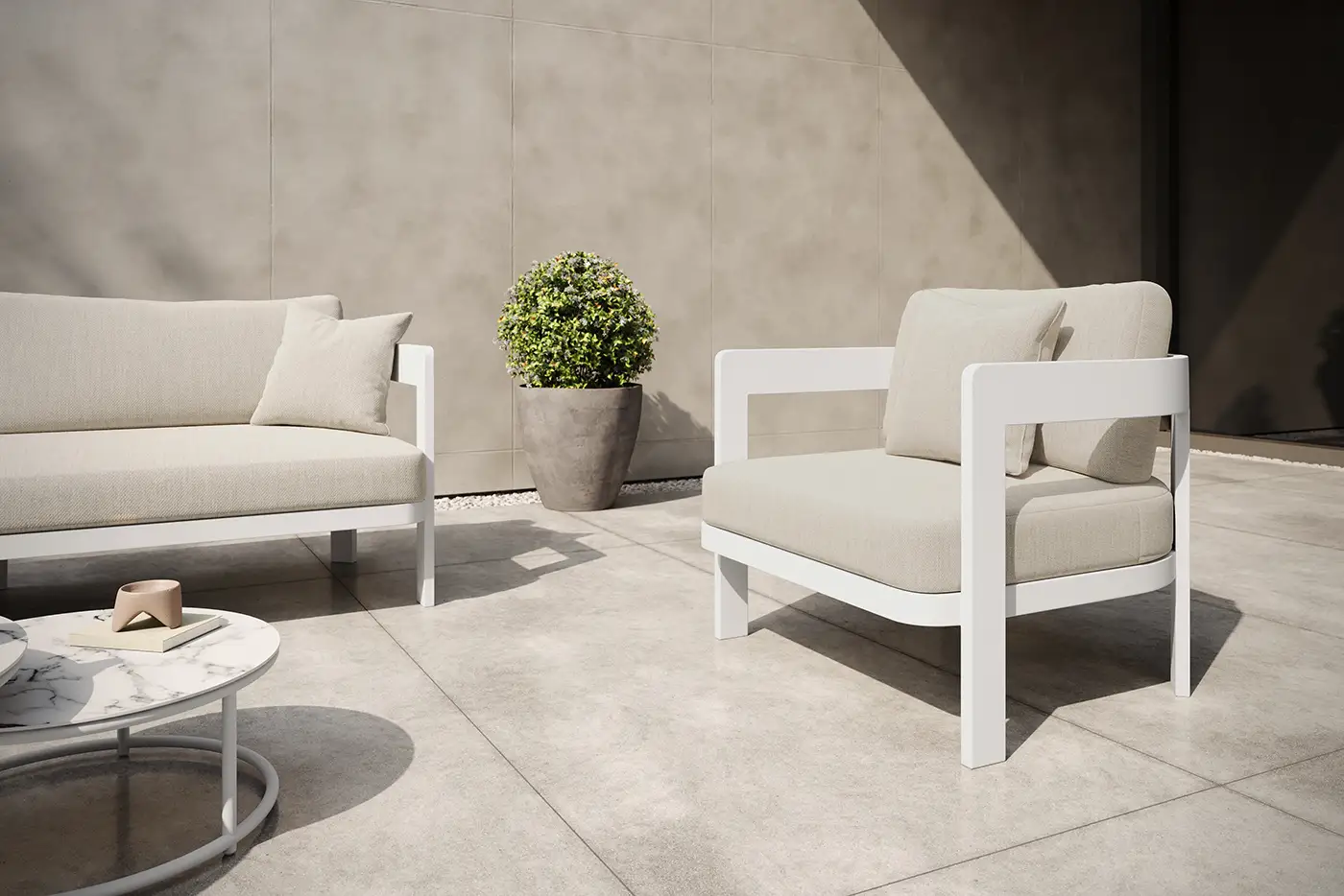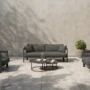 A Domani ülőgarnitúra letisztult formavilágával és időtálló anyaghasználatával ideális választás a szabadtéri pihenéshez. Könnyű, mégis strapabíró porszórt alumínium váza egyszerre biztosít tartósságot és könnyű mozgathatóságot. A kényelmes ülőfelületeket vízáteresztő, UV-álló Olefin párnák teszik teljessé, amelyek gyorsan száradnak, és hosszú ideig megőrzik esztétikus megjelenésüket. Az ülőgarnitúra harmonikusan illeszkedik bármilyen kültéri környezetbe, stílust és komfortot teremtve.
