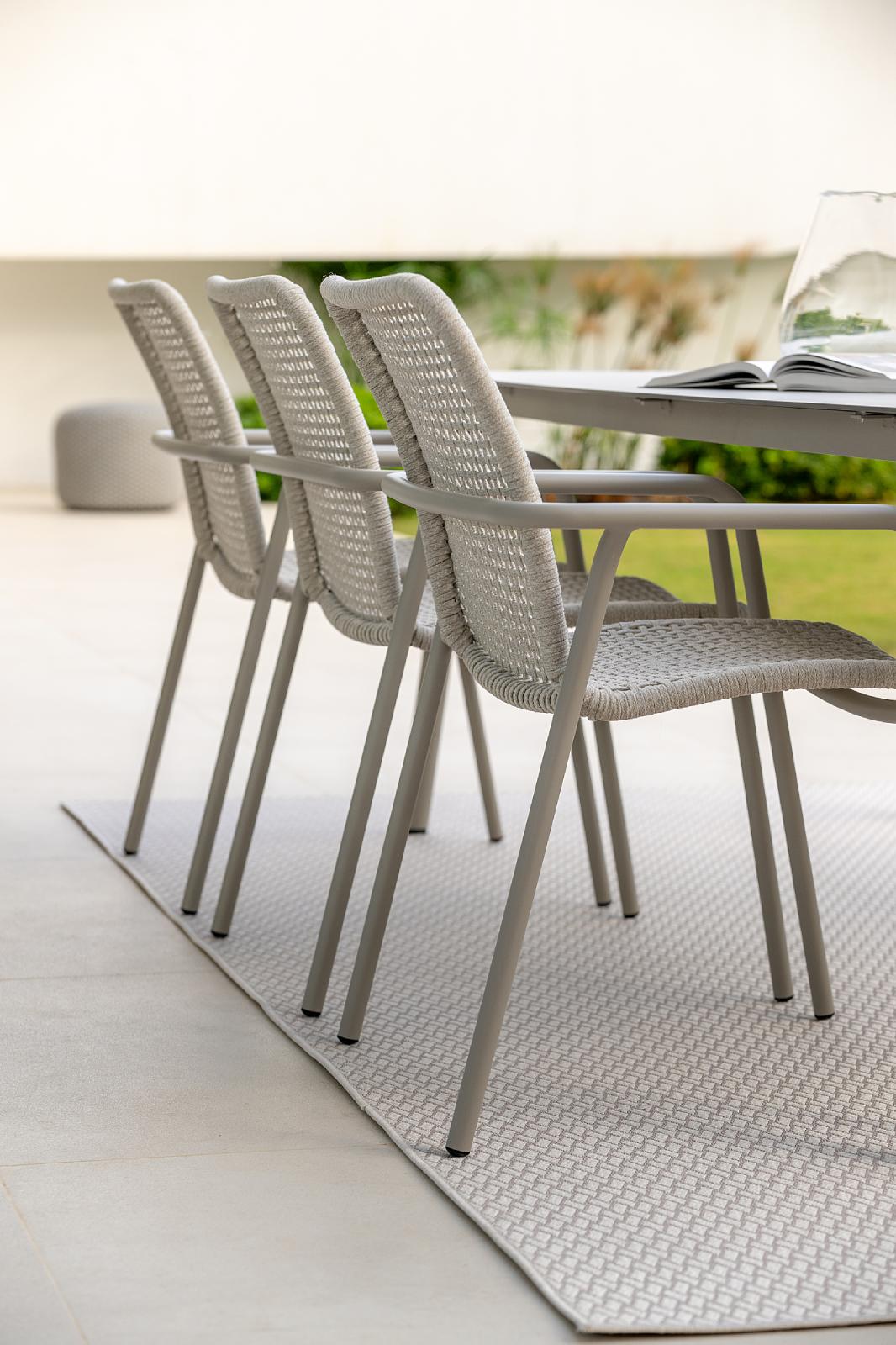 A Durham étkezőszék kortalan formáival és ergonomikus kialakításával a szabadtéri étkezések főszereplője lehet. Egy délig tartó hétvégi reggeli a családdal vagy órákig tartó vacsora a barátokkal – a kényelem alapkelléke a hibátlan étkezőszék. Strapabíró, időjárásálló anyagai hosszú, évekig tartó használatra teszik alkalmassá. A különleges, szintetikus szálakból készült ülőrész és támla rugalmas, ugyanakkor formatartó felületet kínál, továbbá ez az anyag lehetővé teszi a texturált, ritkásan szövött kialakítást, melynek köszönhetően a felületek szellősek, a legforróbb napokon is kellemesek.